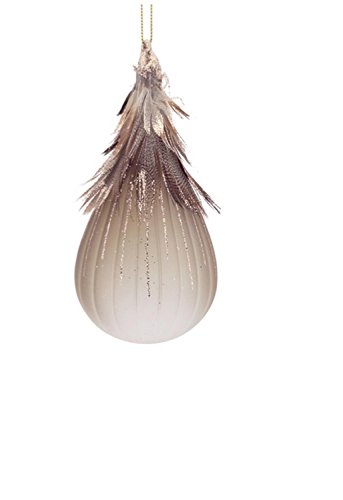 From the Luxury Lodge Collection Elegant frosted glass tear drop ornament is accented with dazzling glitter and feathers Fully dimensional ornament Comes ready-to-hang on a gold cord Dimensions: 6"H x 2.75" W x 2.75"D Material(s): glass/feather